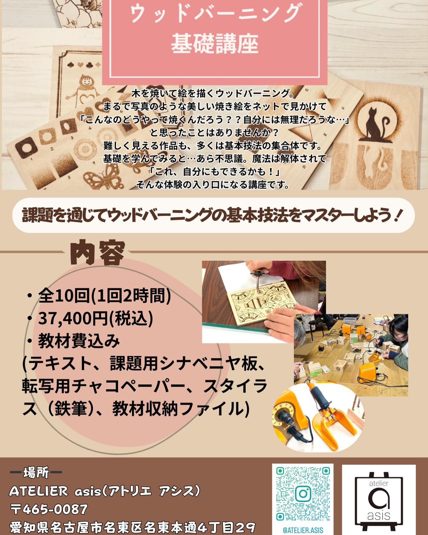 ・教材費込み(テキスト、課題用シナベニヤ板、転写用チャコペーパー、スタイラス(鉄筆)、教材収納ファイル)