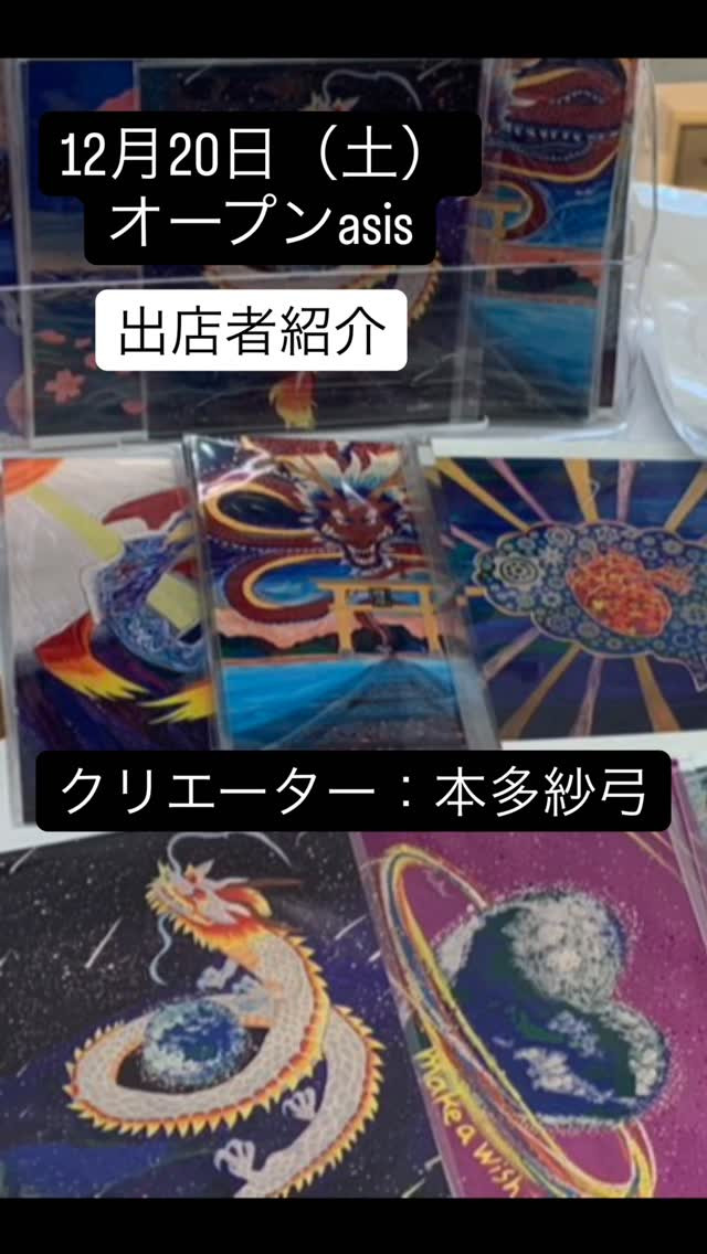 12月20日 12月20日オープンasis出店者紹介クリエーター:本多紗弓@sayum___i『オリジナルしおり作り』ペンや絵の具を使って自分だけのしおりを作ろう!オリジナルしおり作り1回500円(税込)グッズ販売(ポストカ…