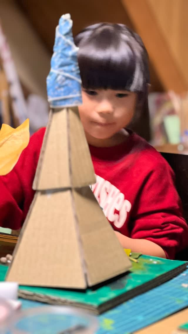 「本日のキッズART」 「本日のキッズART」本日は、前回コーヒーフィルターで色遊びをした素材を活かして、インディアンテントを作りました。自分で、葉っぱや枝を拾って、グルーガンで着けたり、ボンドで着けて自分だけの空間…